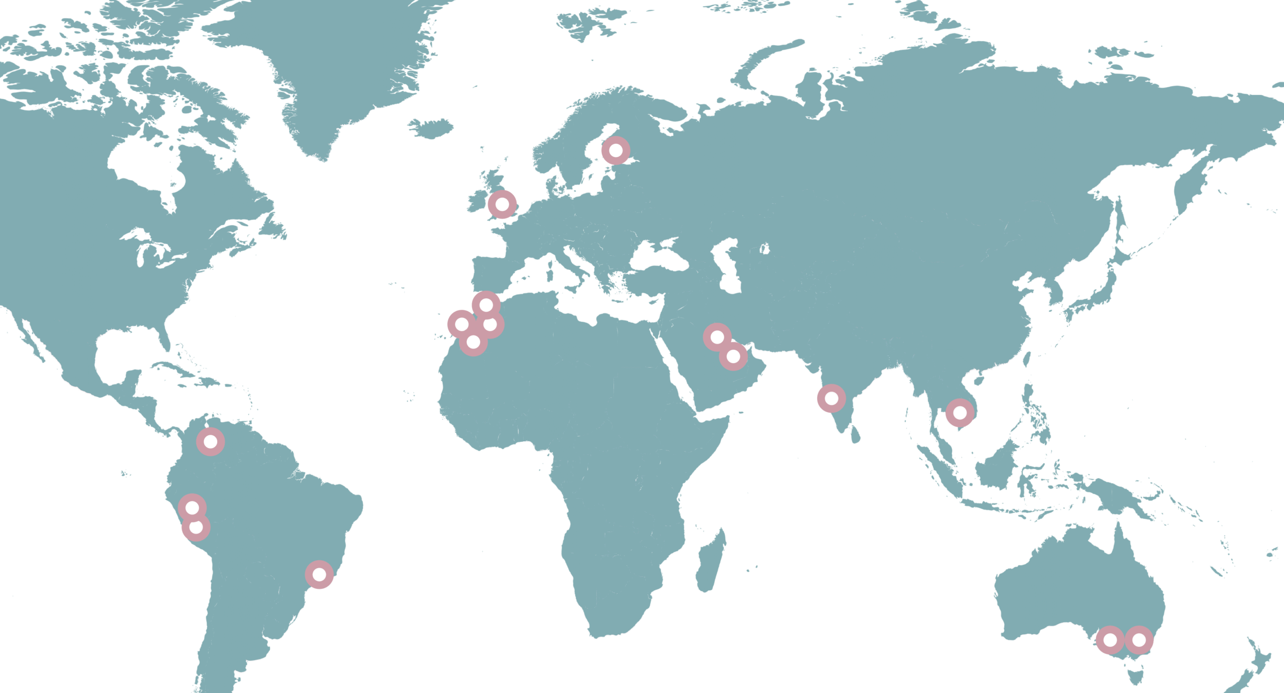 Map showing countries where FinlandWay operates (e.g. UAE, Brazil, Morocco, Argentina)